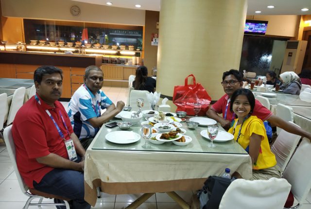 খাবার নিয়ে চমৎকার সব অভিজ্ঞতা আছে। এর একটা অন্তত শেয়ার করা যেতেই পারে। এক বিকেলে আমি আর হারমিন হকি মাঠ থেকে সোজা চলে যাই কয়েকটা কাজ দ্রুত সেরে নিতে। কারণ, গেমস শেষ হয়ে আসছে। হাতে সময় কমে আসছে। কাজ শেষ হতে রাত। আমাদের সর্বশেষ গন্তব্য ছিল সারিনাহ। শামস ভাই ফোন করে কোথায় আছেন জানতে চাইলেন। জানালে বললেন অপেক্ষা করতে। এরপর তারা সেখানে এলেন। তিনি, শৈলেন্দুদা, সোহেল ভাই। সবাই ক্ষুধার্ত। খেতে হবে। সোহেল ভাই কেএফসির ওপর ভরসা রাখলেন। শামস ভাই আমাদের নিয়ে গেলেন একটা ট্র্যাডিশনাল প্যাডাং রেস্তোরাঁয়। টেবিল ভরে গেল নানা পদে। অন্তত ২৫ প্রকার। আমরা চারজনে বেছে নিলাম বেশ কয়েকটা। দাম নির্ধারিত হলো সেই মতো। এ এক দারুণ অভিজ্ঞতা। শাক, ভর্তা, মাছের ঝোল থেকে নানা কিছু। শাকটা খেতে মনে হচ্ছিল যেন পাটশাক খাচ্ছি।