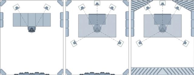 নিচে তিনটি রুম অ্যাকুস্টিক ট্রিটমেন্ট লে আউট দেওয়া হলো। প্রথমটিতে আছে ন্যূনতম দরকারি এবজর্বশন প্যানেল ও বেজ ট্র্যাপ, মাঝের লেআউটে মোটামুটি ভালো অ্যাকুস্টিকের জন্য প্রয়োজনীয় এবজর্বশন প্যানেল ও বেজ ট্র্যাপ আর শেষ লে আউটে আছে এবজর্বশন প্যানেল, ডিফিউজার ও বেজ ট্র্যাপ (পেছনের দেয়ালের সঙ্গে সিলিংয়ে লাগানো ডিফিউজারের নিচে থাকায় লে আউটে দৃশ্যমান নয়), যা একদম প্রফেশনাল কোয়ালিটির রুম অ্যাকুস্টিক নিশ্চিত করে।