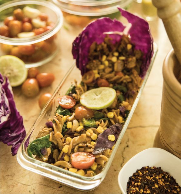 উপকরণ: হোল গ্রেইন ব্রাউন পাস্তা ২৫০ গ্রাম, গ্রিন মুরগির মাংস ২০০ গ্রাম, অলিভ অয়েল পরিমাণমতো, রক সল্ট স্বাদ অনুযায়ী, ক্যাপসিকাম ১টি (কুচি করে কাটা), চেরি টমেটো ১০০ গ্রাম (দুভাগ করে কাটা), বাঁধাকপি কুচি পরিমাণমতো, মাঝারি আকারের পেঁয়াজ ২টি (খোসা ফেলে খোল ছাড়িয়ে টুকরা করে নিতে হবে), সুইটকর্ন ৫ টেবিল চামচ, পালংশাকের পাতা ইচ্ছা অনুযায়ী, বাটার পরিমাণমতো, রসুনকুচি ৫০ গ্রাম, টমেটো কেচাপ পরিমাণমতো, আমন্ড দুধ ১ কাপ, গোলমরিচ ১ চা-চামচ, থাইম অল্প, সয়া সস আধা কাপ, আদাবাটা ২ চা-চামচ, রসুনবাটা দেড় চা-চামচ, মরিচের গুঁড়া আধা চা-চামচ এবং টক দই ২ টেবিল চামচ।