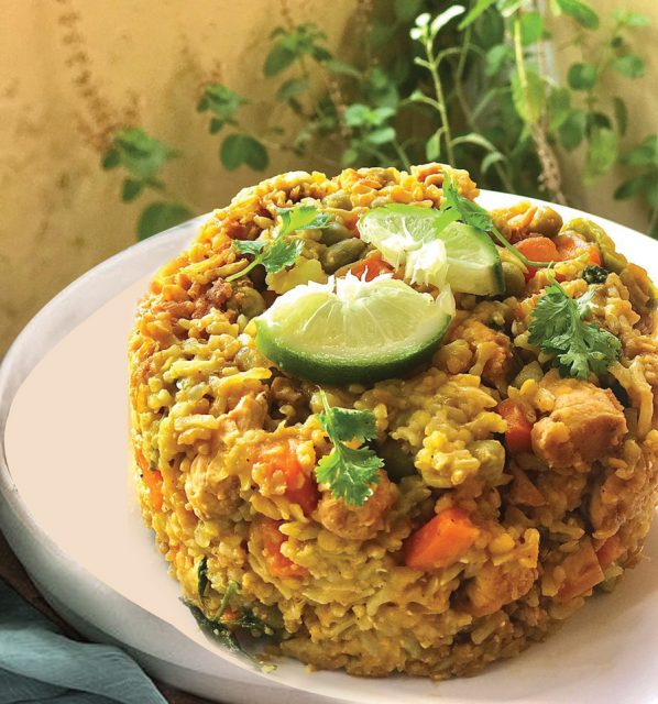 উপকরণ: ব্রাউন রাইস ৩০০ গ্রাম, ডাল ২০০ গ্রাম, ছোট আকারের টমেটো ২০০ গ্রাম (দুভাগ করে কাটা), ক্যাপসিকাম ১টি (কুচি করা), গাজর বড় আকারের ৩টি (ছোট করে কাটা) মটরশুঁটি ২০০ গ্রাম, দারুচিনি ১ ইঞ্চি মাপের ২টি, তেজপাতা ২টি, কাঁচা মরিচ স্বাদমতো, আদাবাটা ২ চা-চামচ, রসুনবাটা দেড় চা-চামচ, বাটার প্রয়োজনমতো, পেঁয়াজ মাঝারি আকারের ২টি (কুচি করে নিতে হবে), রসুনকুচি ৫০ গ্রাম, বাঁধাকপিকুচি প্রয়োজনমতো, হলুদগুঁড়া ১ চা-চামচ, মরিচগুঁড়া ১ চা-চামচ, রক সল্ট স্বাদমতো, গরমমসলা, বাটার, টমেটো কেচাপ ও সয়া সস প্রয়োজনমতো, টক দই ২ টেবিল চামচ, অলিভ অয়েল পরিমাণমতো।