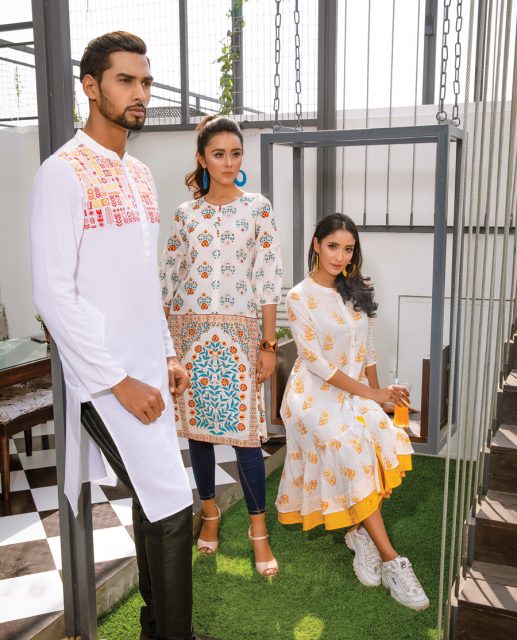 সাদা ভিসকস কামিজে মাল্টিকালার প্রিন্ট আর এমব্রয়ডারির মিশেল। সঙ্গে মানানসই বটম আর টাইডাইড ওড়না