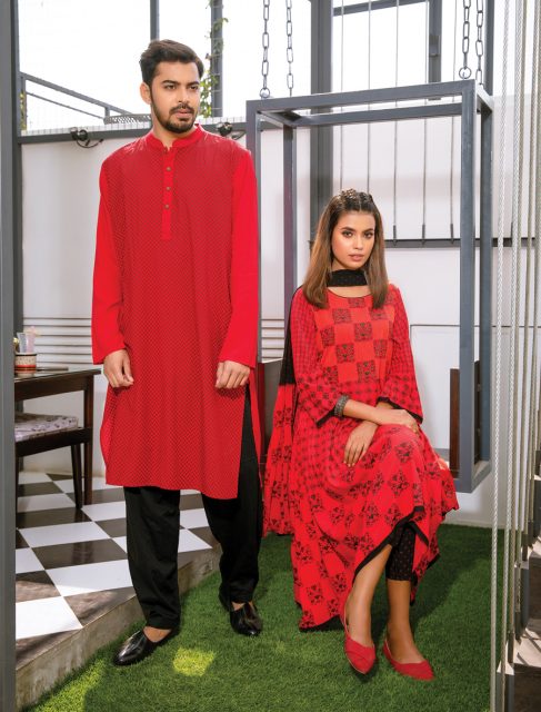 ক্ল্যাসিক কালো-লাল কম্বিনেশনে তৈরি এম্পায়ার কাট কামিজ। পোলকা প্রিন্টের প্যান্ট আর মানানসই দোপাট্টা