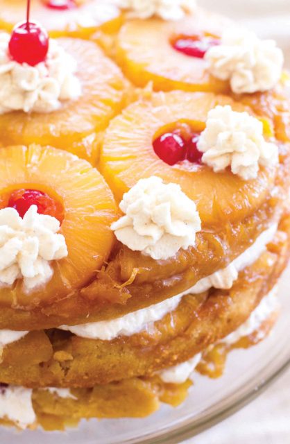 প্রণালি: আনারস সেদ্ধ করে পানি ছেঁকে নিন। বাটার, চিনি ও ডিমের সঙ্গে ময়দা ও অন্যান্য উপাদান মিশিয়ে কেক ব্যাটার তৈরি করে নিতে হবে। এবার চিনি গলিয়ে ক্যারামেল তৈরি করুন। কেক মোল্ডে ক্যারামেল মিশিয়ে তার উপর আনারসের স্লাইস দিতে হবে। আভেনে ১৭০ থেকে ১৮০ ডিগ্রিতে ৩০-৩৫ মিনিট ধরে বেক করে নিন। হয়ে গেলে আনমোল্ড করে নিতে হবে। এ ক্ষেত্রে নিচের দিকটা উপরে থাকবে। তারপর স্বাভাবিক তাপমাত্রায় এলে ফ্রিজে রাখতে হবে। ঠান্ডা হলে পরিবেশন করুন।
