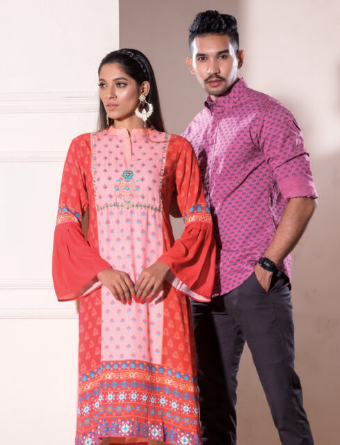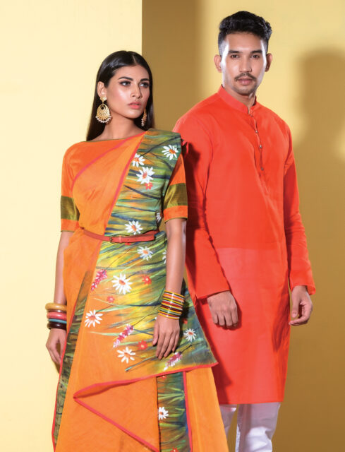 লাল-কমলার কম্বিনেশনে তৈরি স্ক্রিন প্রিন্টেড পাঞ্জাবি।