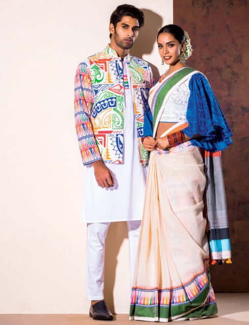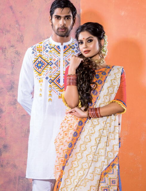 সাদা সুতি পাঞ্জাবিতে স্ক্রিন প্রিন্টেড স্লিভ এবং বাটন লাইন। জিওম্যাট্রিক প্রিন্টেড কালারফুল কটির দারুণ জোড়।