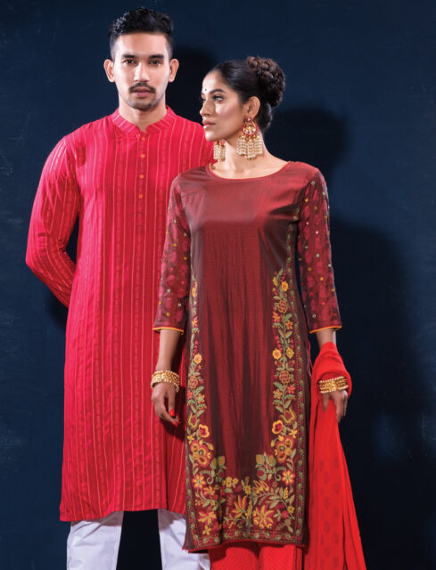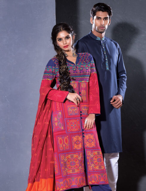 লাল-নীলের ক্ল্যাসিক কম্বিনেশনে তৈরি কামিজ। তাতে জমকালো নকশির ফোঁড় আর স্ক্রিন প্রিন্ট। নেভি ব্লু বটম ও হাফ সিল্কের ব্লক প্রিন্টেড দোপাট্টা।