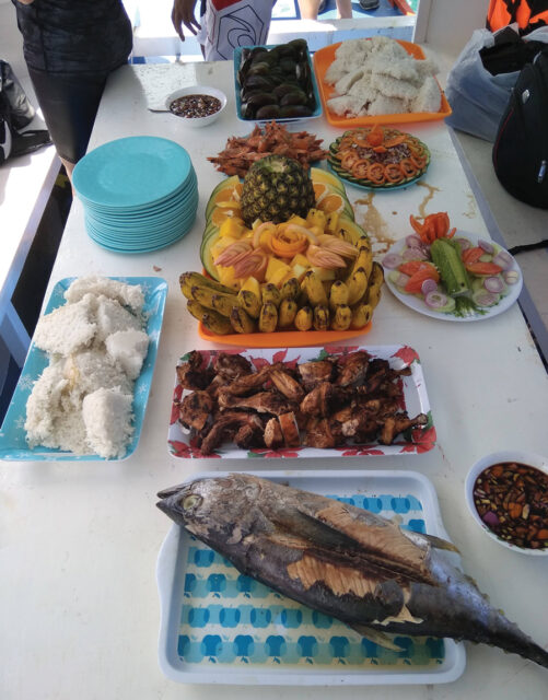 এরপর আমাদের মাঝ সাগরে নিয়ে মধ্যাহ্নভোজন করানোর ব্যবস্থা করা হলো। ক্রুজ শিপে এমন দেখেছি। বোটে দুপুরের খাবার খাওয়া এই প্রথম। জলে দাপাদাপি করে সবাই ভীষণ ক্ষুধার্ত তখন। পরিবেশন করা হয়েছিল, গ্রিলড ফিশ, গ্রিলড চিংড়ি, চিকেন, শামুক সেদ্ধ, স্কুইড ভাজা, স্যালাড, সস, ভাত, বিভিন্ন রকমের ফল ও জুস।