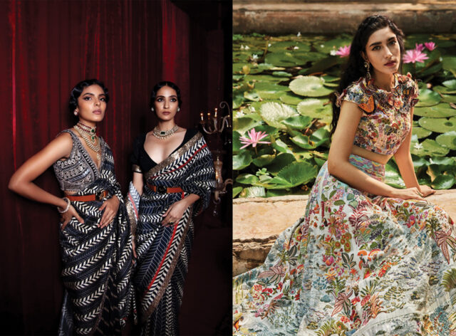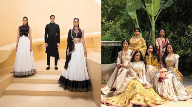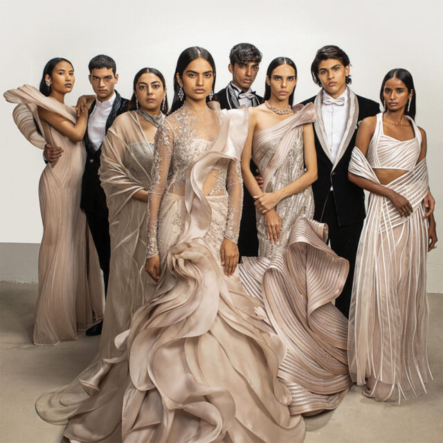 প্রথাগত অথচ নান্দনিক বিয়ের পোশাকের সংগ্রহ দিয়ে চমক দেখিয়েছেন। এই ডিজাইনার জোড় মেয়েদের গাউন, লেহেঙ্গার জন্য বেছে নিয়েছেন হালকা জর্জেট ও শিফন ফ্যাব্রিক। সঙ্গে ছিল মেটালিক এমব্রয়ডারি, সূক্ষ্ম গথ অ্যাপ্লিক আর ক্ল্যাসিক জারদৌসি। তবে সবচেয়ে বেশি নজর কেড়েছে ছেলেদের অ্যাসিমেট্রিক কুর্তা এবং যোধপুরি কোট।