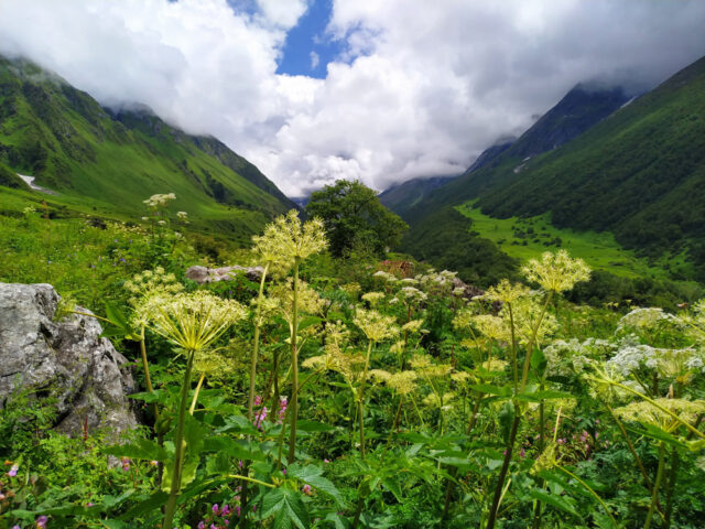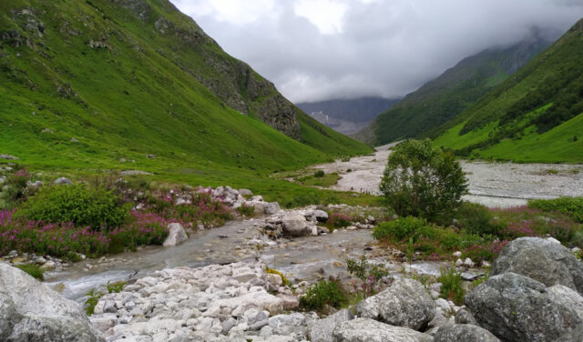 আকাশের মন ভার। রোদের দেখা নেই। চারপাশ ছাপিয়ে মেঘ রাশি রাশি ইচ্ছে জমা করছে। প্রায় চার কিলোমিটার হেঁটে আসার পর মিলল এক সবুজ উপত্যকা। মাঝখানে সাদা সরু ফালি কাটা পুষ্পবতী বয়ে চলছে। উপত্যকাকে দেয়াল করে রেখেছে সবুজ পাহাড় আর শিলাখন্ডের মাথায় মেঘ-বরফের মুকুট। এ রকম উপত্যকায় ফুল না থাকলেও এমনিতেই একটা যুগ কাটিয়ে দেওয়া যায়। অবশ্য বছরে ছয়/সাত মাস এখানে বরফে আচ্ছাদিত থাকে।