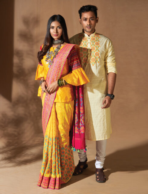 উজ্জ্বল হলুদ রঙা শাড়িতে কনট্রাস্ট কালারের পাড় আর আঁচল। স্ক্রিন প্রিন্ট, এমব্রয়ডারি ও মিরর ওয়ার্কের এমবেলিশমেন্ট। সঙ্গে মানানসই বেল স্লিভের লং ব্লাউজ