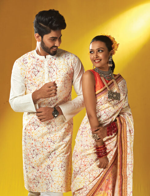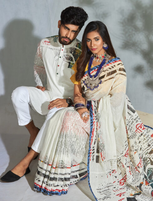 সুতি সাদা পাঞ্জাবিতে ছাপচিত্রের অলংকরণ
