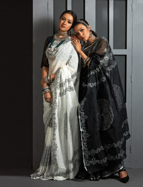 সাদা জমিনের শাড়িতে কালো ব্লক প্রিন্টের কারুকাজ