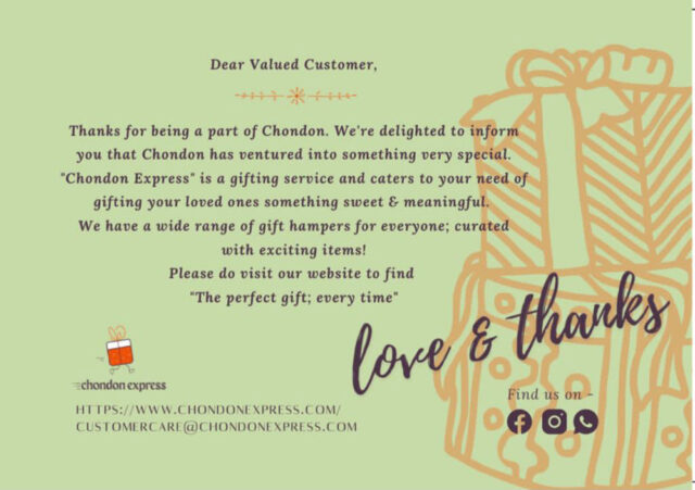 ভবিষ্যতে যে দিবসটি আসছে, তার সঙ্গে মানানসই কোনো গিফট হ্যাম্পারের হদিস চাইলে ক্লিক করা যেতে পারে চন্দনএক্সপ্রেসের ‘কামিং ইভেন্ট’ টাইলে। অর্ডার করে ঠিকানা দিলেই কাক্সিক্ষত ব্যক্তির কাছে উপহারসামগ্রী পৌঁছে দেবে কর্তৃপক্ষ। হিম-এ মিলবে পুরুষদের উপহার। হার-এ নারীদের। শিশুদের জন্য- বেবি। যেকোনো বয়সী প্রিয়জনের জন্মদিনের গিফট হ্যাম্পার আছে বার্থডে টাইলে। করপোরেটে থাকছে কলিগদের জন্য মানানসই সামগ্রী। কাউকে অভিনন্দন জানাতে চাইলে যে ধরনের উপহার পাঠাতে হয়, তা মিলবে কনগ্র্যাচুলেশন টাইলে। প্রেমিক-প্রেমিকা কিংবা দম্পতিদের জন্য ‘কাপল’। উপহারসামগ্রীর সঙ্গে একটি কার্ড দিলে চমকটা আরও বাড়ে। সেটাও মিলবে চন্দনএক্সপ্রেসের কার্ড টাইলে। এসবের ডিজাইন করেন চন্দনা নিজেই। তিনি পুরোদস্তুর একজন ফ্যাশন ডিজাইনার। বাকি টাইলগুলোতে কী মিলবে, তা পাঠকদের আগ্রহের ওপর তোলা থাকল।
