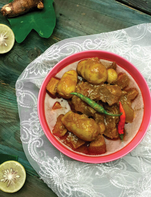 উপকরণ: গরুর মাংস আধা কেজি, পেঁয়াজ আধা কাপ, গরমমসলা ১ চা-চামচ, এলাচি ও দারুচিনি কয়েকটি, আদাবাটা ১ টেবিল চামচ, রসুনবাটা ১ চা-চামচ, লবণ পরিমাণমতো, টালা জিরাগুঁড়া ১ চা-চামচ, হলুদগুঁড়া আধা চা-চামচ, মরিচগুঁড়া ১ টেবিল চামচ, তেল পরিমাণমতো, কচুর গাটি আধা কেজি এবং কাঁচা মরিচ ৩-৪টি।