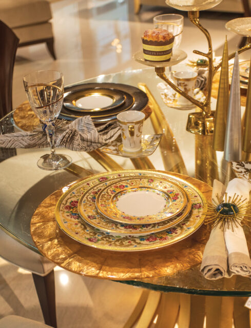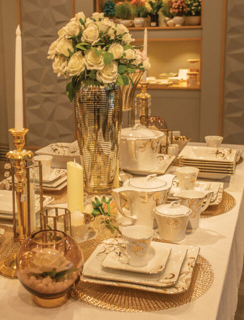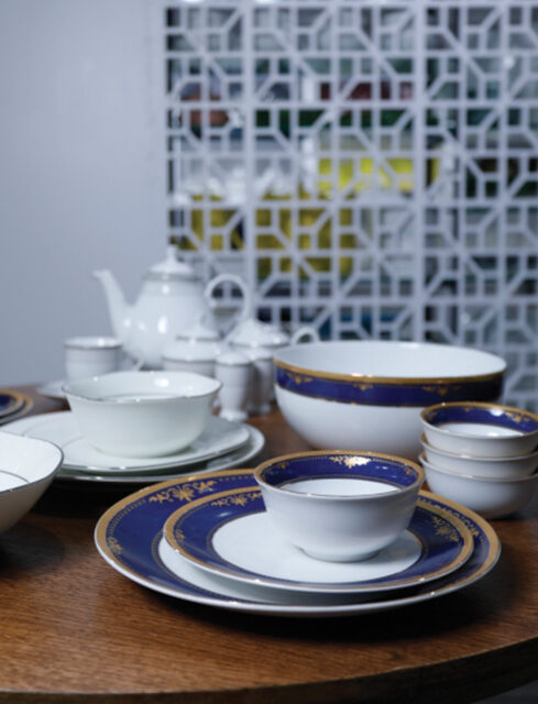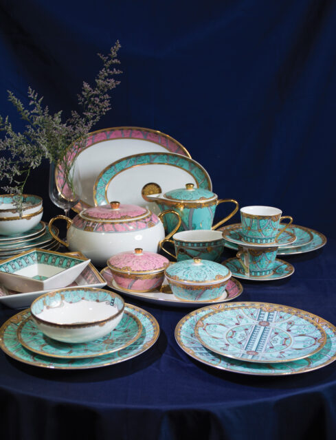 ‘দ্য প্যালেস’। ২৪ ক্যারেট সোনায় গুচ্ছফুলের নকশা। হার্ড জার্মান গ্রেডে প্রিস্টাইন হোয়াইট। বেশ টেকসই। কেননা, প্রস্তুতিকাল থেকেই কঠিন মান নিয়ন্ত্রণ করা হয়েছে। উচ্চ তাপে সাদা পোরসেলিনে সোনা বসানো। করা হয়েছে হালকা নীল ও গোলাপি নকশাও। ডিনার সেট মিলবে ৫২ ও ৩২ পিসে।