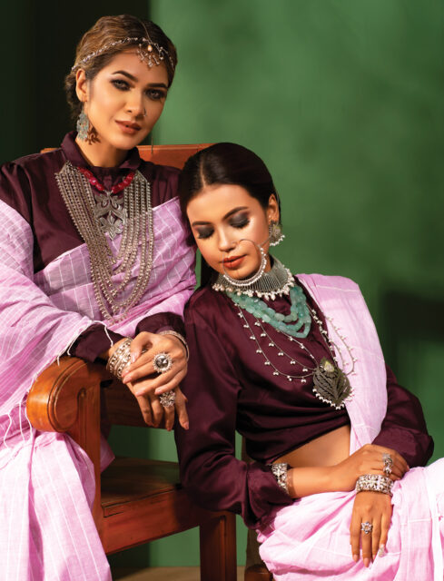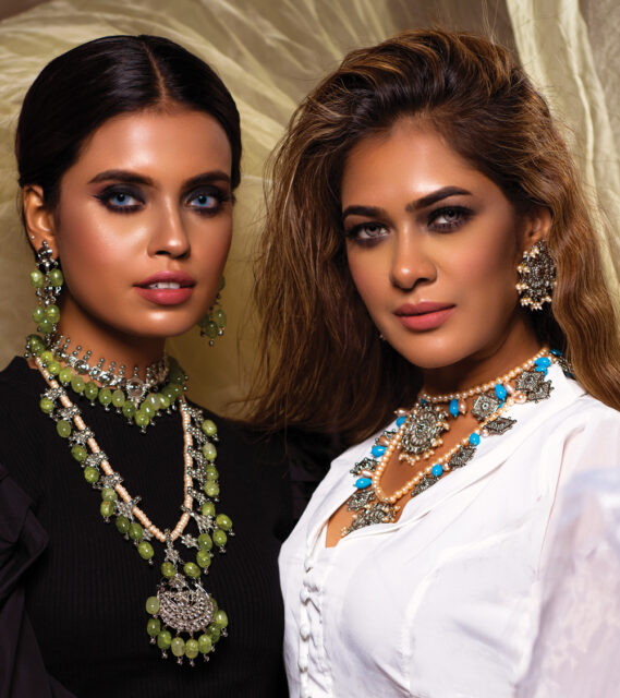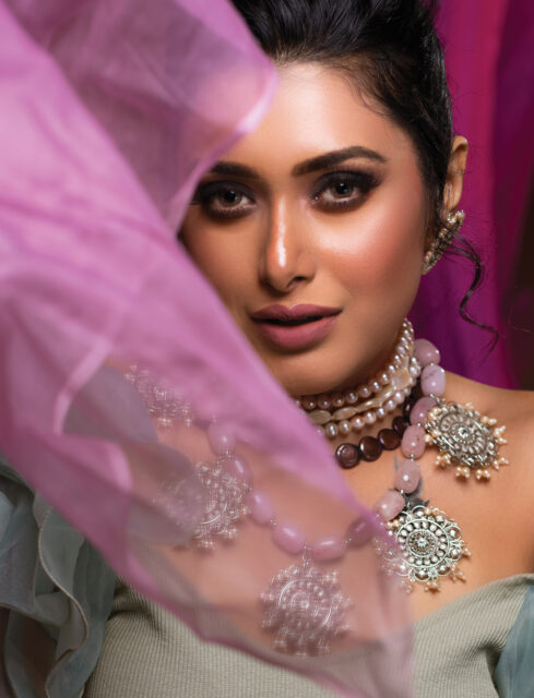 মেটালের জুয়েলারি, সেমি প্রেশাস স্টোন আর পার্লের সেটিং। আনকাট স্টোনের লেয়ারড নেকলেস। নাকে নাকছাবি। হাতে কালো পলার সেট