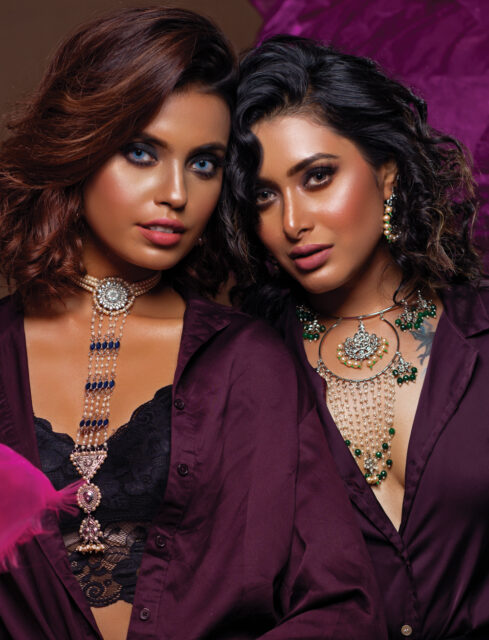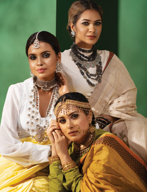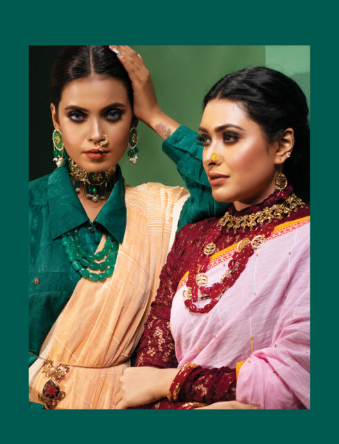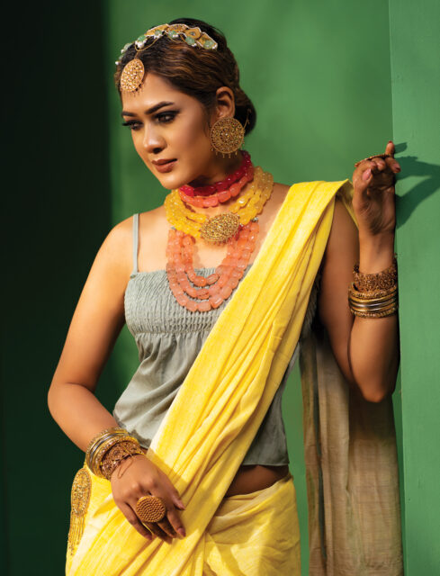 গোল্ডেন বেসের ওপর সেমি প্রেশাস স্টোন বসানো চোকার ও কানের দুল। তাতে পার্ল, কুন্দন আর চেইনের চিকন লেয়ার। সেমি প্রেশাস স্টোনের লেয়ারড নেকলেস। নাকে নাকছাবি