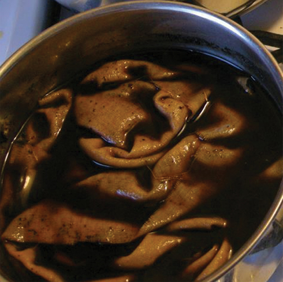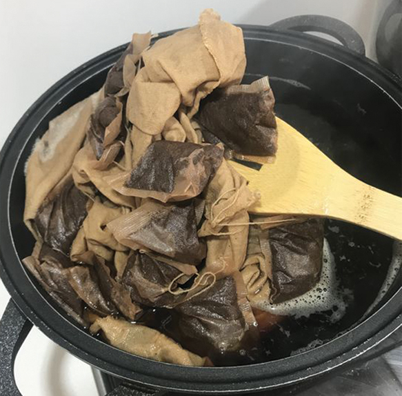এরপর কাপড়টা ডাই করে নেওয়ার পালা। এ ক্ষেত্রে অনেক ধরনের পদ্ধতি প্রচলিত আছে। যেমন ফুটন্ত ডাইটা চুলা থেকে নামিয়ে টি ব্যাগ সরিয়ে তাতে কাপড়টা ডুবিয়ে রেখে দেওয়া হয় সারা রাত। দীর্ঘ সময় রাখলে রং বেশি গাঢ় হয়। অন্য আরেকটি পদ্ধতিতে ফুটন্ত রঙিন পানিতে কাপড়টা ছেড়ে দেওয়া হয়। সে ক্ষেত্রেও আগে থেকে টি ব্যাগগুলো সরিয়ে নিতে হবে পাত্র থেকে। পনেরো মিনিট ফুটিয়ে কাপড়সমেত ডাই চুলায় হালকা আঁচে বসিয়ে রাখতে হয় ঘণ্টাখানেক। তারপর পাত্রটি চুলা থেকে নামিয়ে সারা রাত রেখে দেওয়া হয়