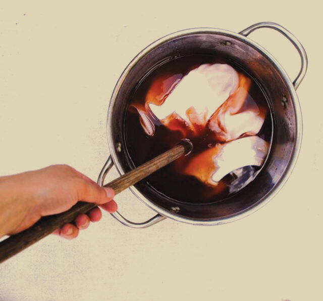 এবার যে কাপড় রাঙানো দরকার, সেটি গরম পানিতে ভিজিয়ে নিতে হবে। টি ডাই আবারও নেড়ে নিতে হবে। তারপরে ভেজাতে হবে ক্লথটি। নেড়ে না নিলে ফ্যাব্রিকের সব অংশে সমানভাবে ডাই না হওয়ার সম্ভাবনা থাকে।