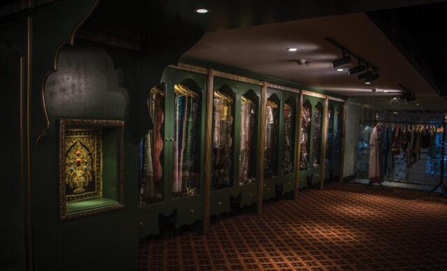 লা মেরিডিয়ান হোটেলের লবি পেরিয়ে একটু এগোলেই দ্য মসলিন। নিচের তলার বেশ বড় একটি অংশজুড়ে এর বিস্তার। ঢুকেই হাতের বামে চমৎকার জারদৌসির কাজ নজর কাড়ে। প্রথম অংশের ডিসপ্লে যা সাজানো হয়েছে সোনারগাঁ লোকশিল্প জাদুঘরের গ্যালারির আদলে। সব পণ্য শেলফে সাজানো। সেটা ছাড়িয়ে ছোট একখানা তাঁতে জামদানি বোনা হচ্ছে।
