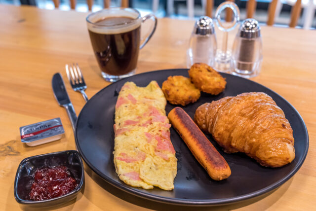 কথার মাঝেই হানি আর ক্রিম দিয়ে চেখে দেখছিলাম ফ্রেঞ্চ টোস্ট। বাটারের গন্ধ আরও খোলতাই করেছে এর স্বাদ। জানা গেল, এই বাটার আর রুটি তৈরির ময়দাও আসে ফ্রান্স থেকে। এরপর পালা বেকন অমলেট, হ্যাশ ব্রাউন অ্যান্ড সসেজ উইথ কোঁয়াসোঁ। যদিও মেনুতে ছিল স্ক্রাম্বল্ড এগ, সেটা বদলে বেকন অমলেট দেওয়া হয়েছিল। বেকন অমলেটের স্বাদ অসাধারণ। কারণ, পোড়া তেলে অমলেট খাওয়া আমাদের জিহ্বায় মাখন বেশ শান্তির পরশ দেয়। হ্যাশ ব্রাউন চলনসই। আর কোঁয়াসোঁ অসাধারণ। সত্যি বলতে, ভিয়েনা থেকে আসা এই রুটি তার আসন বেশ পোক্ত করে নিয়েছে ফরাসি অভিজাত সব রুটির তালিকায়। ভিয়েনার প্রভাব এতটাই বেশি ফরাসি বেকারির জগতে যে পাতিসেরি আর বুলোঞ্জের পাশাপাশি আলাদা করে এখন ভিয়েনোসারি নামের শাখাই তৈরি হয়ে গেছে।