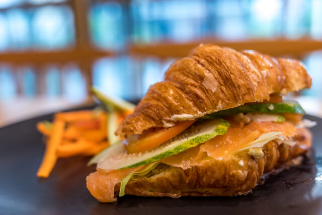 কথায় কথা বাড়ে, তাই ডেলিফ্রান্সের গন্ডি ছেড়ে আলাপ গড়াল আবিদ মনসুরের আরেক প্রকল্প চা-টা নিয়ে। যেখানে ইন্ডিয়ান কুজিন নিয়ে কাজ করার স্বপ্ন রয়েছে তার। অবশ্য তাতেও ডেলিফ্রান্সের খাবার সঙ্গ জোগাল। এবারে তার পছন্দসই খাবারে ভরসা করলাম আমরা। তিনিই জানালেন, এখানকার স্মোকড স্যামন স্যান্ডউইচ তার পছন্দের। ফ্রেঞ্চ কালিনারি জগতে স্যান্ডউইচ নামক খাবারের আগমন কিন্তু তাদের শত্রু-মিত্র দেশ ইংল্যান্ডের কেন্টের স্যান্ডউইচ এলাকা থেকে। ১৭৬২ সাল নাগাদ স্যান্ডউইচের চতুর্থ আর্ল জন মন্টাগু এই খাবার আবিষ্কার করেছিলেন সময় বাঁচাতে। আর সেটাকে ফ্রেঞ্চরা প্রথমে বাগেটে করে, পরে কোঁয়াসোঁয় ভরে খেয়ে চলেছে। ক্রিম চিজ, শসা, টমেটো আর লেটুসের বিছানায় শুয়ে এল মৎস্যরাজ স্যামন। স্মোকি ফ্লেভারের স্যামনের এই কোঁয়াসোঁ আসলেই দারুণ। সঙ্গ দিল ফ্রেঞ্চ ভ্যানিলা ফ্র্যাপে।