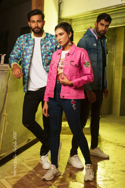 হট পিঙ্ক ডেনিম জ্যাকেটে প্যাচ এমবেলিশমেন্ট। সুপার স্কিনি ফিট বটমের ডেনিমে ফ্লোরাল এমব্রয়ডারি