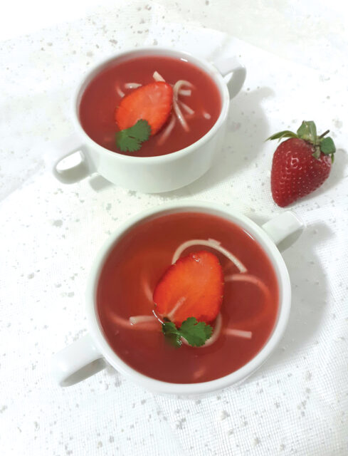 এবার সার্ভিং বাটিতে স্প্যাগেটি দিয়ে স্ট্রবেরি স্যুপ ঢেলে গরম-গরম পরিবেশন করুন।