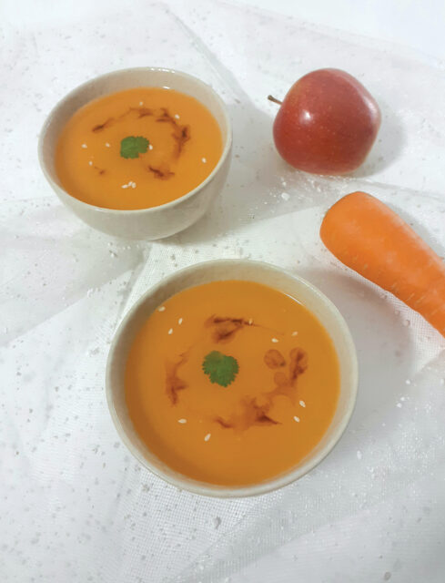 উপকরণ: আপেল কিউব ১ কাপ, গাজর কিউব ১ কাপ, চিকেন স্টক ৪ কাপ, পেঁয়াজকুচি ১ টেবিল চামচ, রসুনকুচি ১ চা-চামচ, আদাকুচি ১ চা-চামচ, লবণ স্বাদমতো, গোলমরিচের গুঁড়া স্বাদমতো, বাটার ২ টেবিল চামচ, ধনেপাতা, সয়া সস ও রোস্টেড সাদা তিল পরিবেশনের জন্য।