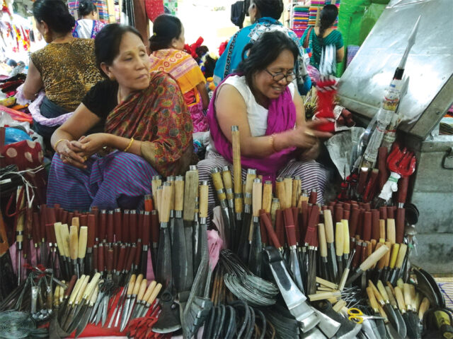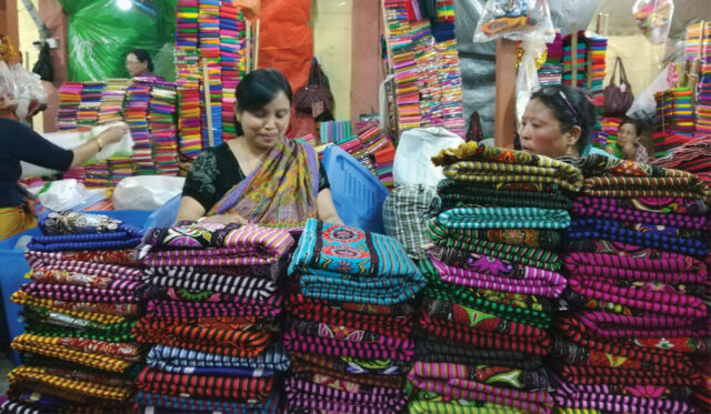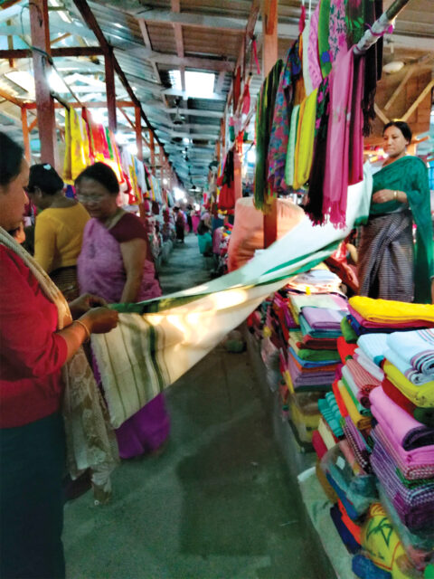 এদের পাশে হস্তশিল্পের দোকান পাশাপাশি সাজানো। মণিপুরি ঐতিহ্যবাহী পোশাক পরা পুতুল, বাঁশের ঝুড়ি, ডালা, কুলা, মাদুর সাজানো দোকানে দোকানে। এদিকটায় ভিড় কম। এক দোকানের ইমা তাই লম্বা হয়ে শুয়ে দুপুরের বিশ্রাম করছেন। আহা, কী নির্ভার, নিশ্চিন্ত জীবন! কী স্বাধীন যাপন! পুরুষ ক্রেতারা সামনে দিয়ে হেঁটে যাচ্ছেন; কিন্তু নিজ দোকানে শুয়ে থাকা ইমার দিকে বাজে দৃষ্টিতে ফিরেও তাকাচ্ছেন না। এর খানিক দূরে সারি সারি দোকান ছুরি, চাকু, দা, বঁটি, কোদাল, কাস্তের। এত সুন্দর করে সাজানো এসব অস্ত্রশস্ত্র দেখে মোটেও ভয় লাগে না। উল্টো মনে হয়, কী যে গোবেচারা, রংবেরঙে সেজে আসর রঙিন করতে চাইছে! এরপরই বিশাল সেকশন আমাদের, মানে নারীদের অতি প্রিয় কাপড়ের দোকানে ঠাসা। এটাই এ মার্কেটের মূল আকর্ষণ। অস্থায়ী দোকানগুলোতে লাল, নীল, হলুদ, সবুজ ফানেক আর ওড়না রঙধনু হয়ে খেলছে যেন। একটা শিশুকে চকোলেটের বিশাল দোকানে ছেড়ে দিলে যে অবস্থা হবে, আমার এখন সেই অবস্থা! কোন দোকান ছেড়ে কোন দোকানে যাব, কী রেখে কী দেখব, দিশেহারা হয়ে যাচ্ছি।