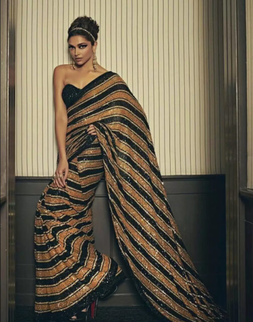 বলিউড অভিনেত্রী দীপিকা পাডুকোন। গেল মাসে হয়ে যাওয়া ৭৫তম কান চলচ্চিত্র উৎসবের মূল প্রতিযোগিতা বিভাগের নয়জন বিচারকের একজন। শুরু থেকেই ছিলেন স্পটলাইটে। তবে রেড কার্পেটে সবচেয়ে বেশি আলোচনায় ছিলেন এই তারকা, তার পরনের শাড়ির জন্য। বেঙ্গল টাইগারের ডোরা কাটার প্রেরণায় করা শাড়িটির নকশা ভারতীয় ডিজাইনার সব্যসাচী মুখার্জির। শাড়ির কালো ও সোনালি ডুরের নকশা ব্লক প্রিন্ট করে এর ওপর হ্যান্ড এমব্রয়ডারি করা। সব্যসাচী অ্যাটেলায়ারের দক্ষ কারিগরদের দিয়ে। দ্য বেঙ্গল টাইগার কতুর শাড়িটি ব্র্যান্ডটির আকাশ তারা কালেকশন থেকে নেওয়া। শাড়ির পাশাপাশি সাজে নজর কাড়ছিল দীপিকার হেডব্যান্ড। সব্যসাচীর বেঙ্গল রয়েল জুয়েলারি কালেকশন থেকে নেওয়া আর্ট ন্যুভো ডিটেইলিংয়ের জুয়েলারি পিসটি ছিল মাথাপট্টির অনুপ্রেরণায় তৈরি। সঙ্গে স্টেটমেন্ট শ্যান্ডেলিয়ার ইয়াররিংয়ে ছিল আর্ট ডেকো গেইজের আধুনিকায়নের পষ্টতা।