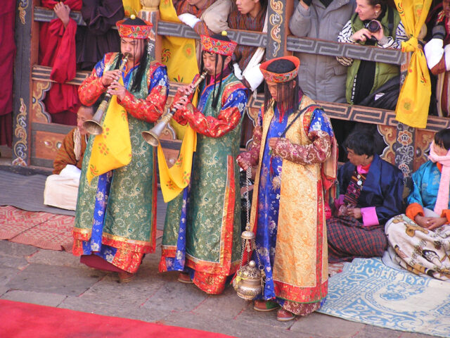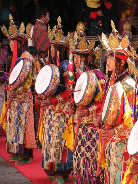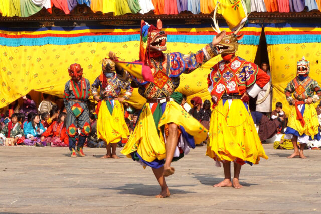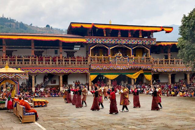 অনুষ্ঠান শুরু হলো একদল বাদ্যযন্ত্রীর বাজনা দিয়ে। রঙিন লম্বা ব্রোকেডের পোশাক, মাথায় মুকুট পরে সানাই, মন্দিরা, সিমবাল, ঢোল বাজিয়ে চারকোনা উঠোনে কয়েকবার পাক খেলেন তারা। এরপর এই আশ্রমের প্রধান ভিক্ষু প্রার্থনা করে মূল অনুষ্ঠান শুরু করলেন। মূল অনুষ্ঠান বলতে আমরা যা জানি, তা হলো মংক ড্যান্স। ভিক্ষুরা বিভিন্ন রঙের লম্বা পোশাক আর বিভিন্ন ধরনের মুখোশ পরে উঠোনজুড়ে নেচে বেড়ান। কয়েকটি কারণে এই নাচের আয়োজন করা হয়: রাজ্যের সমৃদ্ধি, অশুভ শক্তিকে দূর করা, জাগতিক ও পারলৌকিক অনন্ত শান্তি লাভ। আর এটিই হাজার হাজার মাইল দূর থেকে পর্যটকদের টেনে আনে নির্ভার, শান্তিপূর্ণ, অমিয় আবহাওয়ার এই দেশের কোলে।