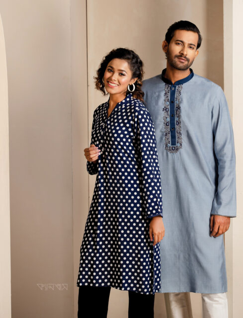 অ্যাশ ব্লু পাঞ্জাবিতে নকশির ফোঁড়। সঙ্গে ম্যাচিং পাজামা
