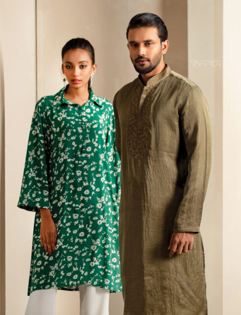 বেইজ পাঞ্জাবিতে এমব্রয়ডারড এমবেলিশমেন্ট। সঙ্গে মানিয়ে পাজামা