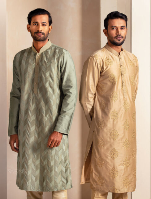 শেওলা সবুজ সিল্কের পাঞ্জাবিতে জারদৌসির কারুকাজ