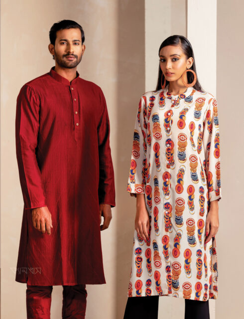 বার্ন্ট রেড প্লিট প্যাটার্নের সিল্ক পাঞ্জাবি। সঙ্গে ম্যাচিং পাজামা