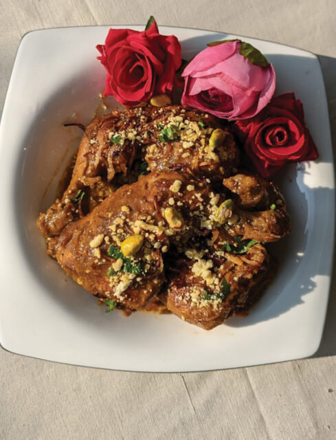 প্রণালি: মুরগির মাংস লবণ দিয়ে মাখিয়ে তেলে ভেজে নিন। তারপর টক দইয়ের সঙ্গে প্রথম পর্বের বাকি উপকরণগুলো মিশিয়ে ব্লেন্ড করুন। এবার দ্বিতীয় পর্বের মসলাগুলো হালকা টেলে গুঁড়া করে নিন। তারপর তৃতীয় পর্বে চুলায় প্যান বসিয়ে তেল গরম করে তাতে গরমমসলা, তেজপাতা, আদা ও রসুনবাটা দিয়ে কষিয়ে নিন। এবার জিরাগুঁড়া, ধনেগুঁড়া, হলুদগুঁড়া দিয়ে চিলি পাউডার ও টমেটো পেস্ট যোগ করে নেড়ে ঢেকে কষিয়ে নিন। তারপর টক দইয়ের মিশ্রণ দিয়ে আবার কষান। এ পর্যায়ে ভেজে রাখা মুরগির মাংস দিয়ে কষিয়ে নিন। তারপর দ্বিতীয় পর্বের ব্লেন্ড করা গুঁড়া মসলা দিয়ে কষিয়ে নিন। এবার দুধ দিয়ে ঢেকে দিন। কিছুক্ষণ পর মাওয়া দিয়ে নেড়ে ঢেকে দিন। চিনি দিয়ে মৃদু আঁচে দমে রাখুন ৮-১০ মিনিট। তারপর গোলাপজল, কেওড়াজল দিয়ে নামিয়ে ফেলুন। সার্ভিং ডিশে সাজিয়ে ওপরে মাওয়া ও পেস্তাকুচি দিয়ে পরিবেশন করুন।