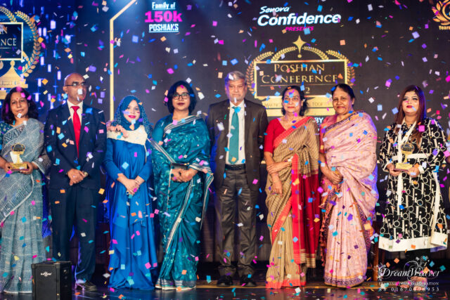 এর পরপরই তারকা মডেল জান্নাতুল ফেরদৌস পিয়া মঞ্চে উঠে আসেন। পরনে ছিল ডিজাইনার সেলিনা নুসরাতের মাস্টারপিস চ্যান্টিলি ব্র্যান্ডের পোশাক। স্ট্র্যাপলেস গোলাপি টপ, মখমলের অ্যাসিমেট্রিক স্কার্ট আর কোমরে চকচকে সবুজ বেল্টে মারমেইডের মতো দেখাচ্ছিল তাকে।