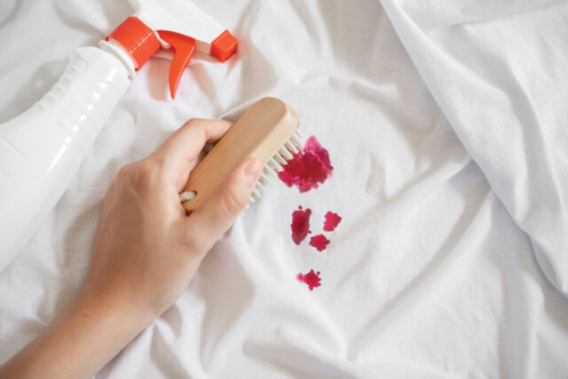 কাপড়ের রং যদি শুধু সাদা হয়, তাহলে দাগ তোলার জন্য ব্যবহার করা যায় এনজাইম দিয়ে তৈরি স্টেইন ট্রিটমেন্ট প্রোডাক্ট। এ জন্য প্রথমে ঠান্ডা পানি দিয়ে দাগ ধুয়ে নিয়ে তার ওপরে অ্যাপ্লাই করতে হবে এনজাইমেটিক স্টেইন ট্রিটমেন্ট প্রোডাক্ট। তারপরে সম্পূর্ণ কাপড়টি ধুয়ে নিলে ভালো। আর শুকাতে দেওয়ার আগে দেখে নিতে হবে স্টেইন রিমুভ হয়েছে কি না। দাগ রয়ে গেলে কাপড় শুকাতে দেওয়া থেকে বিরত থাকতে হবে। নয়তো হিট দাগটি সেট করে দেবে কাপড়ে।