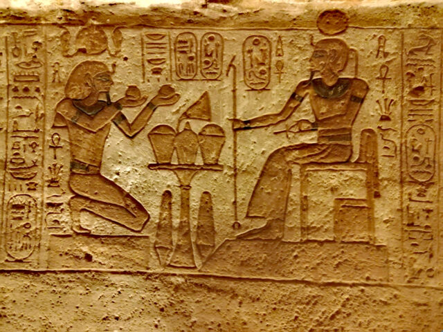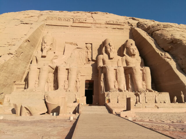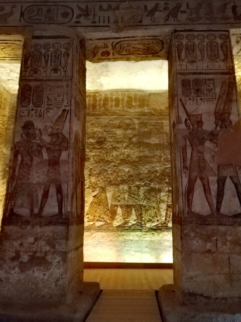 দ্বিতীয় রামসেস তার শাসনামলে এতই বিখ্যাত ছিলেন, সমস্ত পৃথিবী তাকে ‘রামসেস দ্য গ্রেট’ নামে জানত। নিজের মন্দির নির্মাণের জন্য তিনি নাসের লেকের নীল জলের তীরে এমন একটি পাহাড় বেছে নিয়েছিলেন, যার অভ্যন্তরে গুহা ছিল। এই মন্দিরের সদর দরজা দিয়ে প্রবেশ করলে প্রথমেই সামনে পড়ে রামসেসেরই আটটি দণ্ডায়মান মূর্তি। এগুলো মুখোমুখি দাঁড়ানো। চারটি সারি সারি ডান পাশে, চারটি বাঁ পাশে। আর ভেতরে, ডানে-বাঁয়ে এই পাহাড়ের গুহায় মোট দশটি কক্ষ রয়েছে। ভেতরে ঘুটঘুটে, গা ছমছমে অন্ধকার। পায়ের কাছে অল্প কয়েকটি হালকা পাওয়ারের লাইট না থাকলে কিছুই চোখে পড়ত না।