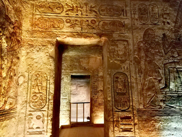 মন্দিরের ভেতরের দিকে আরও তিনটি কক্ষে একইভাবে হায়ারোগ্লিফিকসের নকশা কাটা। আধো আঁধারের খেলা গুহার ভেতরে। কোথাও রানি সিংহাসনে; কোথাও তিনি রাজার সঙ্গে পানীয় পানে, আনন্দে মত্ত; কোথাও তাকে উপঢৌকনে সমৃদ্ধ করছে প্রজাকুল, ফুল দিয়ে বরণ করছে। এত ঐশ্বর্য, এত রাজকীয়তা দেখে চোখে এক আবেশ তৈরি হয়; সঙ্গে যোগ হয়েছে সোনালি মরু প্রান্তর, যেন পৃথিবীর সব স্বর্ণ জড়ো করে সাজানো হয়েছে এই স্বপ্নসাগর। মরুভূমির বালিকে মনে হয় এক সোনালি সাগর। দূর থেকে দূরে দুলে দুলে ওঠে কেবল!