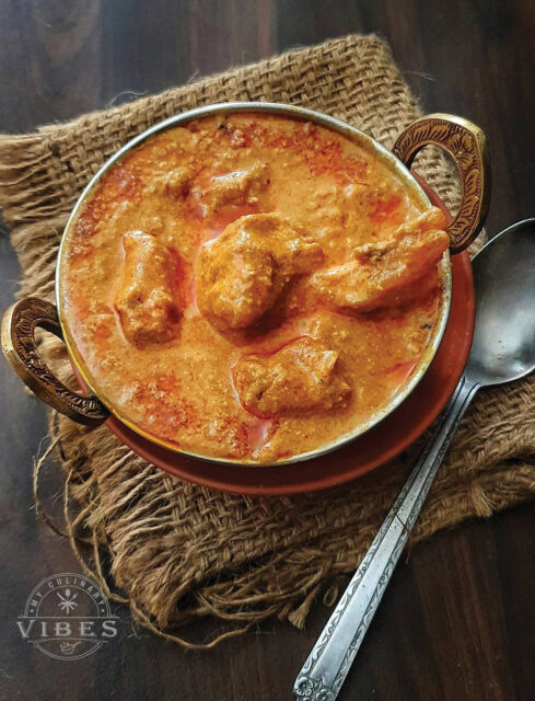 প্রণালি: প্রথমে একটি পাত্রে পানি গরম করে তাতে খাসির মাংস দিয়ে কয়েক মিনিট সেদ্ধ করে নেওয়া চাই। তারপর চুলা থেকে নামিয়ে তাতে রসুন ভিজিয়ে রাখুন। এবার একটি প্যানে ঘি গরম করে তাতে সেদ্ধ করা মাটন দিয়ে একটু ভেজে নিয়ে, হালকা ভাজি হলে একে একে রসুন, এলাচি, দারুচিনি, হলুদগুঁড়া, মরিচগুঁড়া, লবণ ও পানি দিয়ে দিতে হবে। এবার হালকা আঁচে বাদামি না হওয়া পর্যন্ত ভেজে নিন। মাংস বাদামি হলে একটু পানি যোগ করুন। পানি শুকিয়ে গেলে তাতে বাদাম পেস্ট, ক্রিম ও দুধ দিয়ে অল্প আঁচে ১৫ মিনিট রান্না করে নামিয়ে নিন।