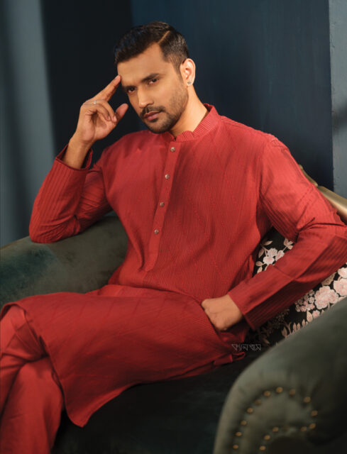সেলফ টেক্সচারড লাল পাঞ্জাবি। বাটনে রুপালি মুগ্ধতা।