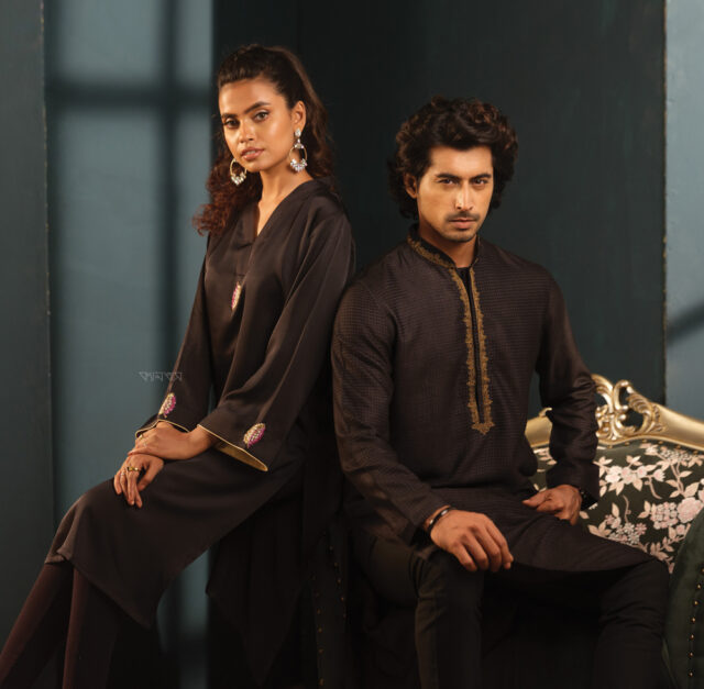 কালো আর সোনালির সন্ধি। পাঞ্জাবির বুননে মুনশিয়ানা। নেকলাইন থেকে বাটন প্লেট জুড়ে সৃজনশীল অলংকরণ