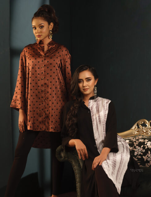 লং শার্টে ক্যাজুয়াল ভাইব। সলিডের সঙ্গে টাইডাইয়ের পাশাপাশি অবস্থান। কালো আর ছাই, মিলেমিশে লিরিক্যাল