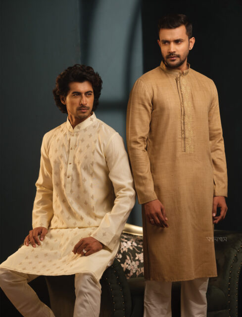 ঘিয়ে পাঞ্জাবি জুড়ে সোনালি সুতার কাজ। আড়ম্বরপূর্ণ উপস্থাপন। মিনিমাল মোটিফ ও বোতাম। নেকলাইন বাহুল্যহীন