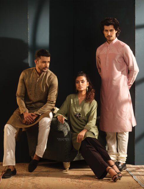 পাঞ্জাবি-কটি-চুড়িদারের রাজসিকতা। মাখন রং আর বাদামিতে গোলাপির উজ্জ্বল উপস্থিতি