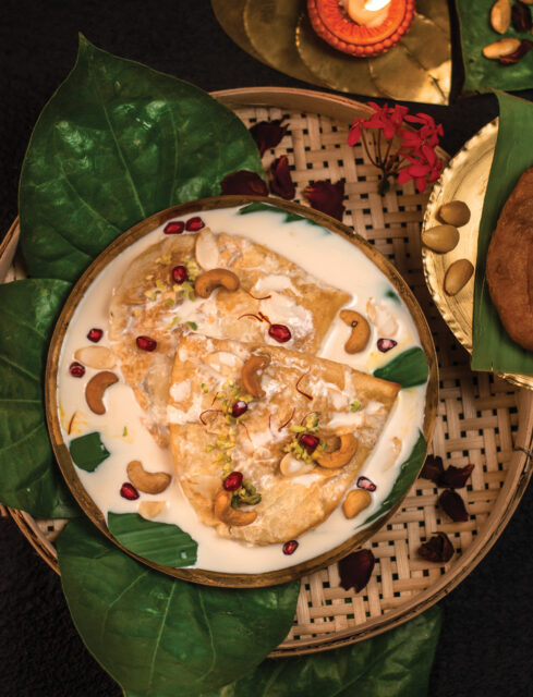 প্রণালি: প্রথমে ময়দায় ঘি, লবণ ও অল্প পানি দিয়ে মেখে নিয়ে একটি ডো বানিয়ে ১০ মিনিটের জন্য রেখে দিন। এরপর এ থেকে ছোট ছোট লেচি কেটে তাতে ক্ষীরের পুর ভরে লুচির মতো করে বেলে নিন। একটি প্যানে তেল গরম করে তাতে এই পুর ভরা লুচিগুলো ভেজে তুলে রাখুন। এরপর কড়াইতে দুধ বসিয়ে জ্বাল দিয়ে তাতে চিনি যোগে ঘন করে প্রায় আধা লিটারের মতো হয়ে এলে খোয়া ক্ষীর দিয়ে ভালো করে নেড়ে মিশিয়ে নিন। এবার এতে কনডেন্সড মিল্ক দিয়ে নাড়ুন। আরেকটু ঘন হয়ে এলে লুচি যোগ করুন। এরপর এলাচিগুঁড়া ছড়িয়ে দিয়ে চুলা নিভিয়ে দিন। ঠান্ডা হয়ে এলে, প্লেটে ঢেলে পেস্তাকুচি ও আমন্ডকুচি, জাফরান ছড়িয়ে কাজুবাদাম ও কিশমিশ যোগে সাজিয়ে নিন। তারপর ঠান্ডা-ঠান্ডা পরিবেশন করুন।