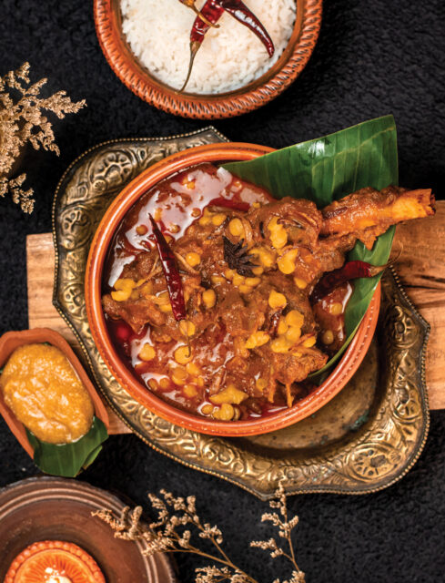 উপকরণ: খাসির মাংস ৫০০ গ্রাম; ঘি ২ টেবিল চামচ; পেঁয়াজকুচি ১ কাপ; আদাবাটা ১ টেবিল চামচ; রসুনবাটা ২ টেবিল চামচ; আস্ত গোলমরিচ ১০-১২টি; কাঁচা মরিচ ৩-৪টি; মসুর ডাল, অড়হড় ডাল, বুটের ডাল, সবুজ মুগ ডাল ও মুগ ডালের মিশ্রণ ১ কাপ; হলুদগুঁড়া ১ চা-চামচ; মরিচগুঁড়া ১ টেবিল চামচ; ধনেগুঁড়া ১ টেবিল চামচ; জিরাগুঁড়া ১ টেবিল চামচ; গরমমসলার গুঁড়া ১ চা-চামচ; কুমড়া ২০০ গ্রাম; আলু ২০০ গ্রাম; বেগুন ২০০ গ্রাম; টমেটোকুচি ১ কাপ; মেথিশাক ১ কাপ; লবণ স্বাদমতো; তেজপাতা ২টি; আস্ত গরমমসলা ১০ গ্রাম।