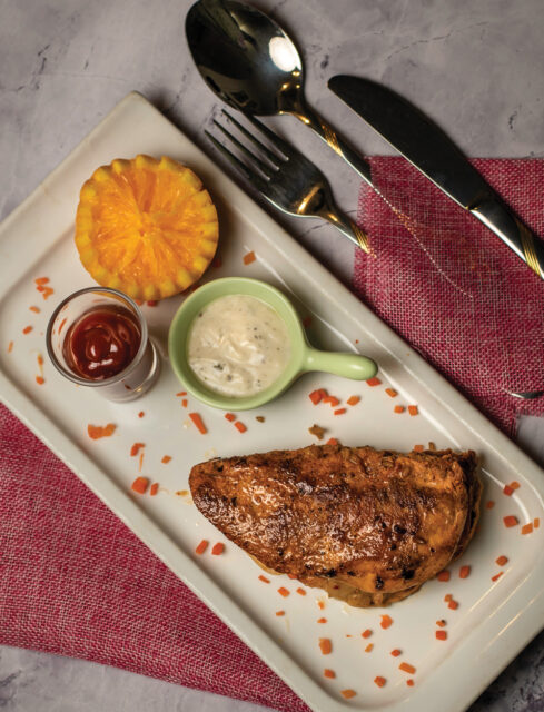 উপকরণ: চিকেন বেস্ট ১টি, লেবুর রস ১ টেবিল চামচ, অরেঞ্জ জুস (মাল্টার) ১ টেবিল চামচ, টমেটো কেচাপ ১ টেবিল চামচ, সয়া সস ১ টেবিল চামচ, ব্রাউন সুগার ১ চা-চামচ, গোলমরিচগুঁড়া ১ টেবিল চামচ, আদাবাটা ১ চা-চামচ, রসুনবাটা ১ চা-চামচ, মরিচগুঁড়া ১ চা-চামচ, মাশরুম স্লাইস ১ টেবিল চামচ, তেল পরিমাণমতো, লবণ স্বাদমতো।